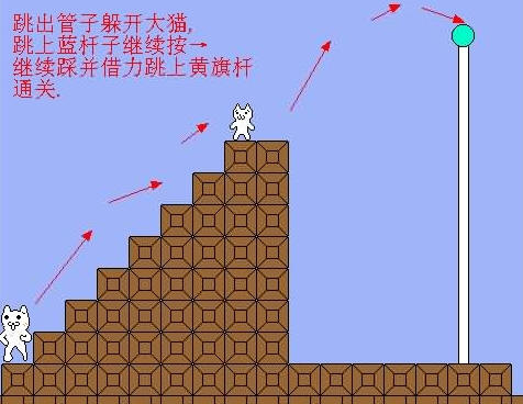 跳出管子躲开大猫跳上蓝杆子继续按右方向继续踩并借力跳上黄旗杆通关